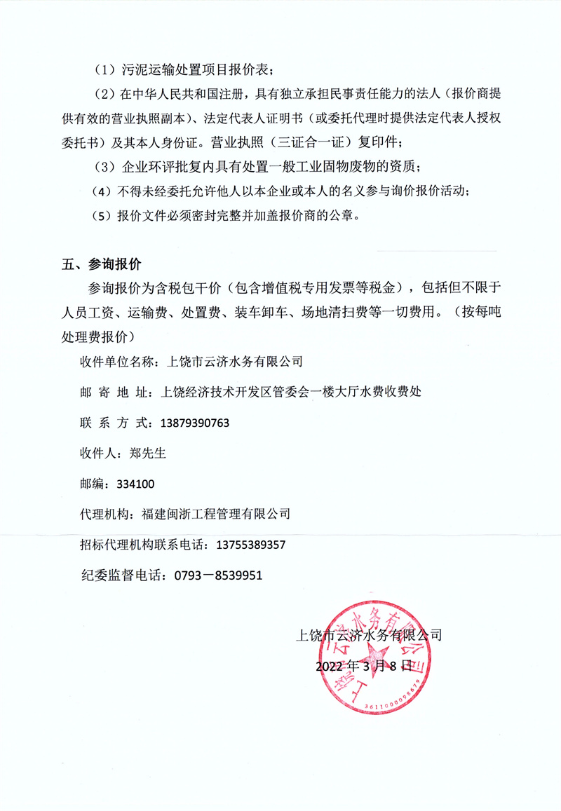 上饒市云濟(jì)水務(wù)有限公司污泥運輸處置項目詢價公告